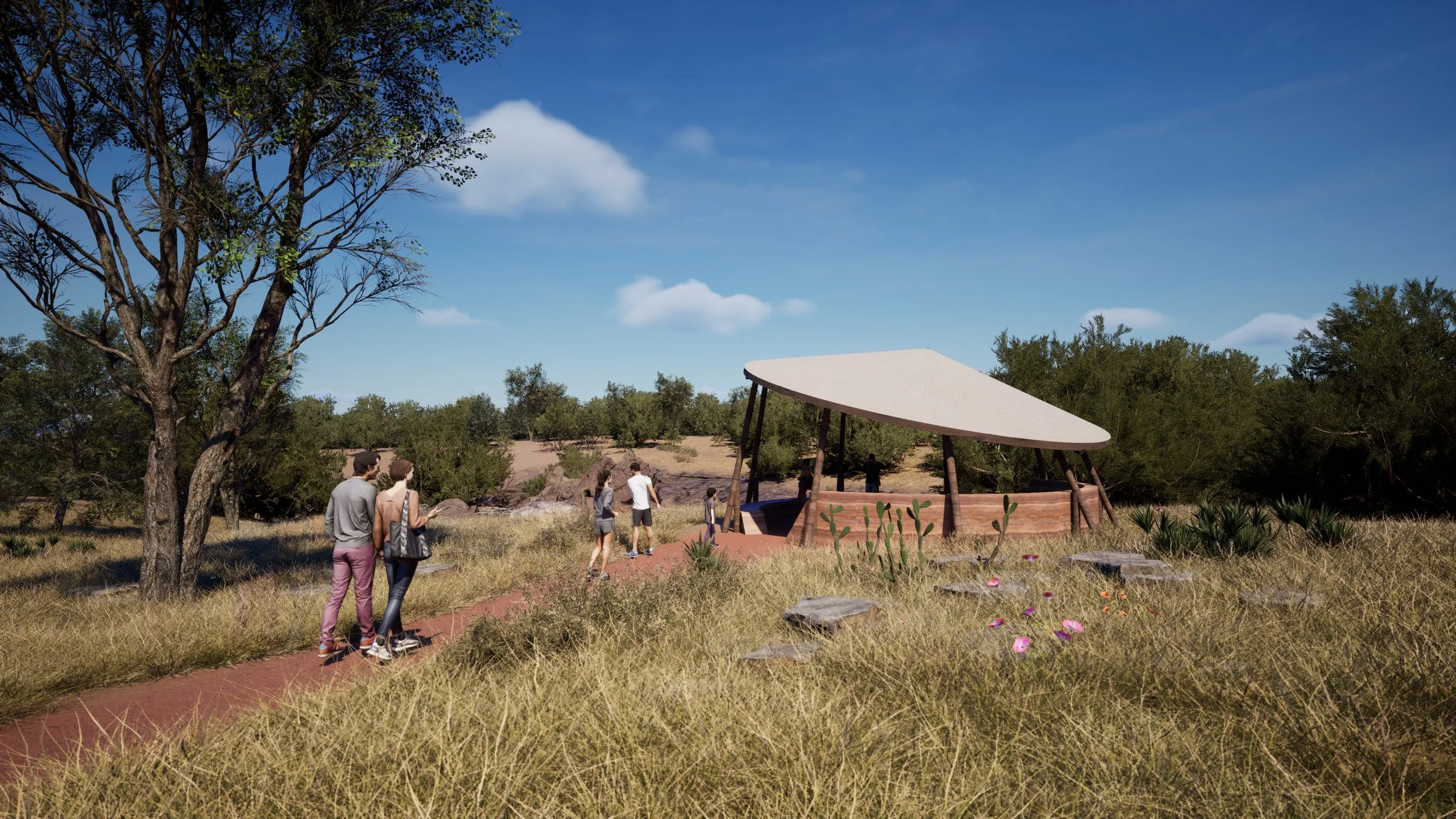 One piece of feedback from our workshops with tribe members was the need for more shade on the site. We proposed creating circular areas (inspired by Apache knowledge) in the landscape that enable the gathering of small- to mid-size groups of up to 30-40 people. Available for any purpose, they could be configured in a way that enables storytelling, performance, making, and much more. From our discussions, it would make sense to have at least one of these facing in each of the cardinal directions. Correct orientation, places to sit and to conduct activities, plantings, and shade structures are all important considerations. Within the context of ensuring these are useful, the Foundation could explore a range of regular programming that could be developed in concert with other organizations and individuals who are holders of specific knowledge. Of special note is the possibility of using these spaces for programs of Apache language instruction. It becomes important to consider, in that regard, how and where best to situate these places so that students have maximal access to varied resources and activities that assist in learning Apache.